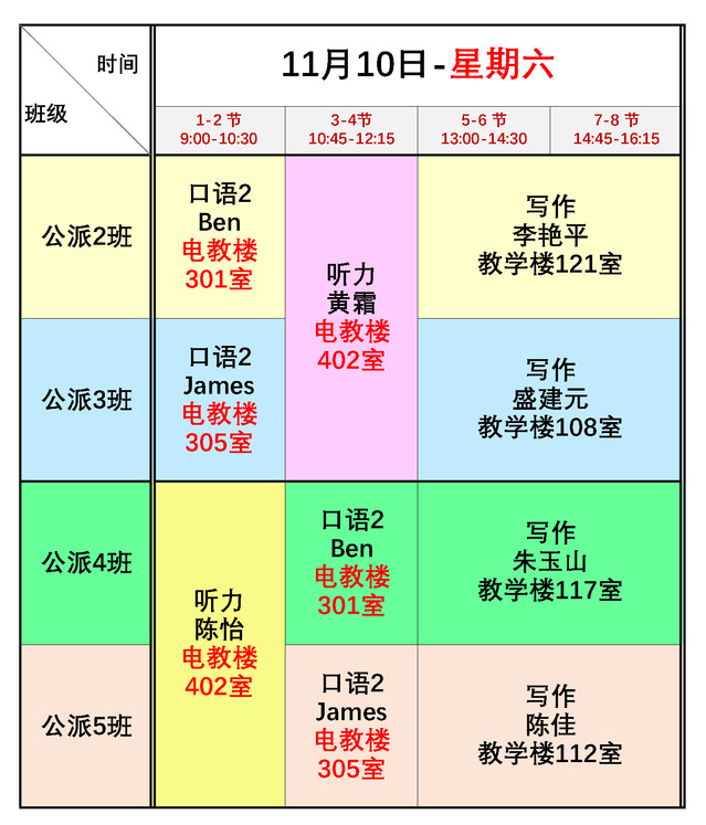 一、调课安排: 根据上海市政府办公厅发布《关于调整首届中国国际进口博览会期间公众休息日安排的通知》规定,将11月5日(周一)调整为休息日,相应将11月3日(周六)调整为工作日上周一的课;将11月6日(周二)调整为休息日,相应将11月11日(周日)调整为工作日上周二的课。 二、业余制班具体安排: 1、公派生英语高级班业余制班(2-5班): 11月3日(周六),上11月5日周一的课,请学员们下午14:00准时到校(参加陈佳老师听力补课的学员中午12:20准时到校); 11月4日(周日),正常上周日的课,请学员们上午9:00准时到校; 11月5日(周一)、11月6日(周二)休息; 11月7日(周三),正常上周三的课,请学员们下午14:00准时到校; 11月10日(周六),上11月11日周日的课,请学员们上午9:00准时到校,教室调整为上午电教楼教室上课,下午原教学楼教室上课,具体安排如下: